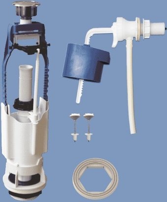 для бачка унитаза, пластик, боковой подвод воды, однорежимный, белый/синий/хром