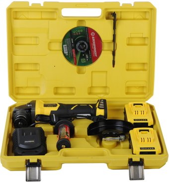 | Комплект поставки | 1. Зарядное устройство- 1шт. 2. Аккумуляторная батарея- 2шт. 3. USB LED фонарик- 1шт. 4. Быстросъемный защитный кожух – 1шт. 5. Боковая рукоятка -1шт. 6. Гаечный ключ -1шт. 7. Разметочный карандаш с твердосплавным наконечником -1шт. 8. Абразивный диск "Боекомплект"-1шт. |