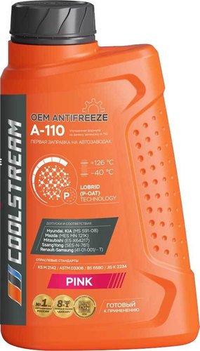 Описание Coolstream A-110 — фосфатный лобридный антифриз (P-OAT), используемый для заправки в новые автомобили на заводах Hyundai и KIA по всему миру. Специально разработан под технические требования Hyundai-KIA, обладает официальным допуском Hyundai, KIA MS 591-08. | |