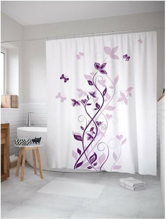 форма прямоугольная, материал шторки полиэстер, кольца в комплекте, 180х200 см, белый/фиолетовый