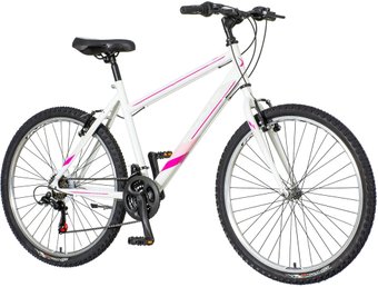 26", горный, женский, сталь Hi-ten, вилка жесткая (сталь Hi-ten), трансмиссия 18 скор. (3х6), переключатели: задний Shimano/передний Shimano, тормоз ободной механический