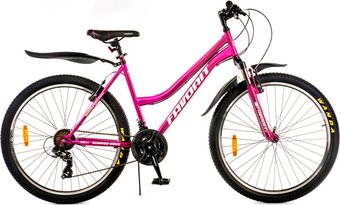 26", рама 19", горный, женский, сталь Hi-ten, вилка амортизационная, трансмиссия 21 скор. (3х7), переключатели: задний Shimano/передний Shimano, тормоз ободной механический, вес 15.9 кг