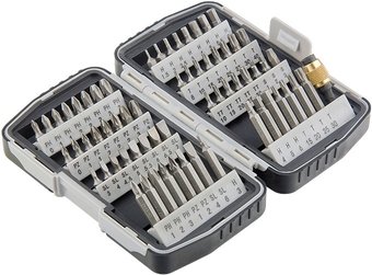 64 шт, хвостовик шестигранный, рабочий размер биты: PZ0, SL4.5, SL5.5, SL6.5, PH1, PH2, PH3, PZ1, PZ3, PZ2, H5, H6, H4, T30, T40, T10, T15, T20, T25, SL3, H3, T27, H2, H2.5, H5.5, SL4, SL5, SL6, SL7, PH0, T8, H1.5