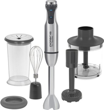 | Комплектация | Насадка блендера и венчик из нержавеющей стали. Подставка для блендера. Крышка для стакана с защитой от брызг. Чаша измельчителя объемом 0,5 л. Мерный стакан объемом 0,7 л. |