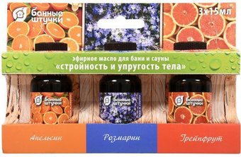 Описание Набор эфирных масел "Стройность и упругость тела" - состоит из трех флакончиков по 15мл каждый с ароматами апельсина, грейпрфрута и розмарина. Набор эфирных масел позволит выбрать аромат который понравится или скомбинировать свой индивидуальный аромат. Масла трав из набора обладают не только расслабляющим эффектом, но и оказывают влияние на состояние кожи, оказывая подтягивающий и стимулирующий эффект. | |
