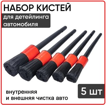 Описание Кисти для детейлинга - мягкие щетки для мойки, чистки щелей или зазоров салона автомобиля (приборной панели, воздуховодов), набор 5 штук, красный-черный. | |