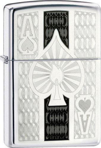 Описание Оригинальная серебристая зажигалка zippo с изображением пикового туза. | |