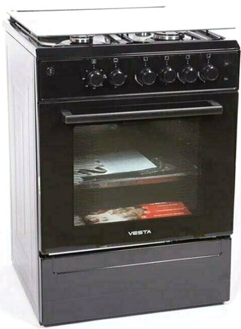 газ + электро панель + электрический духовой шкаф, поверхность: эмалированная сталь, крышка из закалённого стекла, энергопотребление A, управление механическое, без таймера, размеры (ШхГхВ): 60x60x85 см, цвет черный