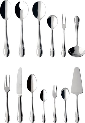 | Состав столового набора | вилка столовая, вилка десертная, вилка для салата, вилка для сервировки, ложка столовая, ложка для салата, ложка чайная, ложка соусная, ложка для сахара, ложка для сервировки, нож столовый, лопатка для торта |