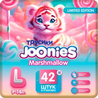 Описание ✅ Трусики-подгузники Joonies Marshmallow L 9-14 кг (42 шт) - самые современные ультрамягкие подгузники-трусики, разработанные с использованием передовых технологий и уникальных дышащих материалов. Обеспечивают невероятный комфорт, максимальную защиту и безопасность для малыша. | |