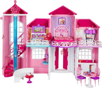 Описание Домик для Барби полностью соответствует домику куклы из сериала «Барби: жизнь в доме мечты». У себя в Малибу Барби живет в шикарном особняке вместе со своими родственниками и друзьями. В двухэтажном доме шесть комнат, в каждой комнате элегантная мебель и множество аксессуаров, выполненные в классическом розовом цвете, украшенные эмблемами Барби и привлекательными наклейками. На первом этаже находится кухня с обеденным столом, за которым куклы могут собраться и обсудить последние новости, а также просторная гостиная, где без особого труда можно устроить вечеринку. На второй этаж ведет эксклюзивная винтовая лестница, там располагается туалетный столик, для отдыха имеется спальная комната с большой кроватью и даже туалет. | |