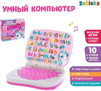 Описание «Умный компьютер» — это увлекательная развивающая игрушка, которая познакомит малыша с алфавитом, цифрами, основами счёта, правописания и логики, а также развлечёт стихами. | |