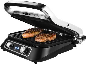 Отличный гриль без излишеств. Доводилось пользоваться так же другими, более "умными" моделями но они справлялись на 3 из 5. Всё равно приходилось контролировать процесс готовки. Рабочая поверхность большая, порадовала возможность развернуть крышку на 180. Удобный отсек для жира, легко снимаются панели. Из минусов могу отметить не идеальное антипригарное покрытие, лучше смазывать маслом и низкие бортики, часть жира попадает под панель и пригарает. В остальном отличный вариант за приемлемые деньги.Достоинства: разворот крышки на 180