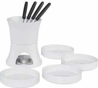 Купил в подарок жене. По качеству есть небольшие огрехи - пришлось подбирать из разных коробок отедельно чашу и некоторые тарелки потому как были маленькие дефекты глазури (возможно попался набор из уже отсортированых деталей). Также пластмассовые ручки у вилок сомнительного качества (отливы от пластмассовой формы). В реальности набор оказался сильно крупнее чем выглядит на фото. И во время самой первой трапезы у нас немного пригорал шоколад - может опыта маловато или рецептура не та. В остальном имеет приятный вид и функциональность (надо только приноровиться). Фондю получилось очень вкусным и необычным несмотря на выше перечисленые недостатки. Подарок получился хороший.Достоинства: Выше