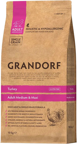 | Ингредиенты | Дегидрированное мясо индейки (27%), Свежее мясо индейки (26%), Цельнозерновой коричневый рис, Гидролизованный белок индейки (5%), Жир индейки (5%), Свежее масло лосося (2%), Льняное семя, Порошок корней цикория (натуральный источник пребиотиков: ФОС и инулин), Пивные дрожжи (природный источник МОС), Глюкозамин (1500 мг/кг), Хондроитин сульфат (1000 мг/кг), MSM (метилсульфонилметан, 40 мг/кг), Сушеное яблоко, Сушеный шпинат, Сушеная брокколи, Сушеная клюква, Сушеная черника, Юкка Мохаве. Кроме заявленных в составе животных ингредиентов продукт может содержать следы ДНК других ингредиентов животного или растительного происхождения в незначительных количествах из-за технологических особенностей производства кормов. |