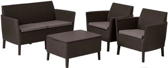 диван + 2 кресла + столик, стол: 760×560×420 мм, основание - пластик, столешница - пластик, сиденье: 740×670 мм, материал: пластик