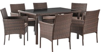 стол + 6 стульев, стол: 1300×900×740 мм, основание - искусственный ротанг, столешница - искусственный ротанг, сиденье: 580×600 мм, материал: ткань
