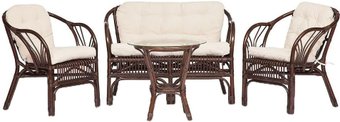 диван + 2 кресла + столик, стол: 500×500×560 мм, основание - ротанг, столешница - стекло, сиденье: 610×670 мм, материал: ткань