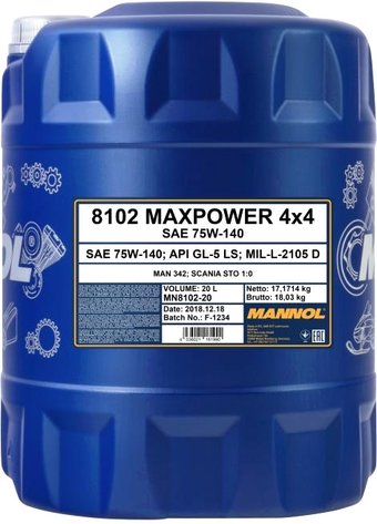 Описание Mannol Maxpower 4x4 75W-140 GL-5 - полностью синтетическое высококачественное трансмиссионное масло, предназначенное для смазки всех типов дифференциалов, в том числе и для дифференциалов повышенного трения, где требуется масло "Limited Slip Oil API GL5". Обеспечивает высокую защиту от износа. Специально разработано для высоконагруженных трансмиссий спортивных и полноприводных автомобилей. | |