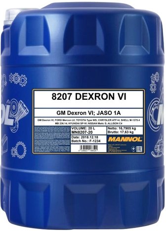 | Допуски и спецификации | Allison C-4, ATF M-1375.4, Chrysler ATF +4, Ford Mercon LV, GM Dexron VI, Hyundai/Kia ATF SP-IV, Jaso 1A, Nissan Matic S, Toyota Type WS |