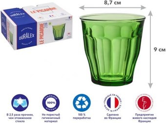 Описание Коллекция Picardie известна своим культовым дизайном от ТМ Duralex , который подойдет к любому столу и событию. Практичные, эстетичные, прочные и эргономичные стаканы. Стеклянная посуда ТМ Duralex производится во Франции с 1945 года. Процесс закаливания придает стеклу ТМ Duralex особую прочность. Во время закаливания стекло ТМ Duralex , предварительно нагретое до 700С, подвергается резкому охлаждению холодным воздухом. Этот процесс делает стекло ТМ Duralex в 2,5 раза более устойчивым к механическим повреждениям, чем отожженное стекло. Характеристики: ударопрочное закаленное стекло, термостойкость до 130 C (EN 1183), можно мыть в посудомоечной машине, подходит для использования в микроволновой печи. | |