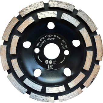 Описание Мощная двухрядная алмазная чашка диаметром 125 мм по бетону GRAFF для быстрой обработки поверхности, которая достигается за счет большего содержания алмазной крошки в сегменте - профессиональная алмазная чашка для шлифовки легкоармированного бетона, бетона, гранита, искусственного и природного камня, керамической и тротуарной плитки. Количество шлифовальных сегментов равно 20. | |