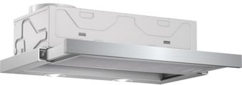 конструкция телескопическая, монтаж для встраивания, ширина 59.8 см, управление механическое/кнопочное, производительность вытяжки 400 м³/ч, цвет нержавеющая сталь