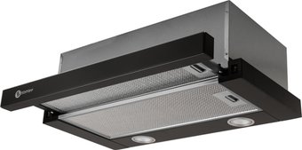 конструкция телескопическая, монтаж для встраивания, ширина 59.5 см, управление механическое/кнопочное, производительность мотора 750 м³/ч, цвет черный