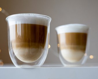 Стакан с двойным стеклом, поэтому можно брать в руку даже если кофе сразу из кофемашины, стакан будет просто теплым, не горячим.Достоинства: Можно брать в руку