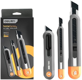 Описание ✅ Набор технических ножей "Home Series Gray" Deli HT4003C включает в себя три ножа: 9 мм, 18 мм и Т-образный. | |