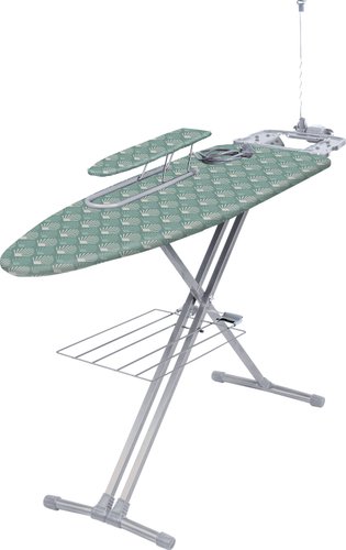 Полочкой для белья вряд ли будем пользоваться.Достоинства: Подставка для утюга, держатель для провода, розетка, полочка для белья.