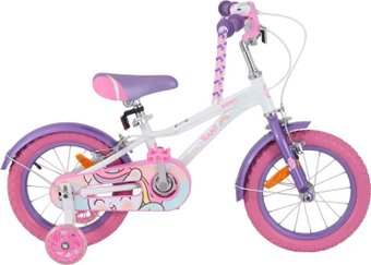 двухколесный велосипед с приставными колесами для девочек, возраст: 3-5 лет, рост: 95-105 см, сиденье: обычное (седло), колеса 14'', рама: сталь Hi-ten, вилка жесткая