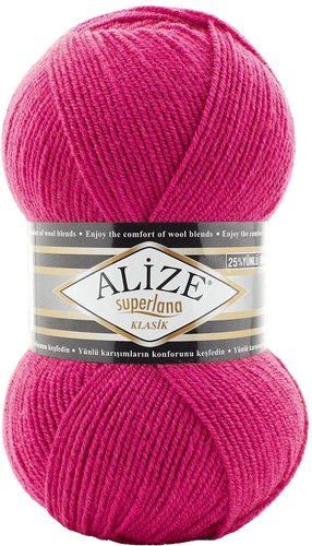 25% шерсть - 75% акрил, 280 м, 100 г, фуксия, нить однотонная, структура классическая, для спиц 3-4 мм, для крючков 3-4 мм