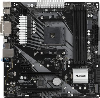 mATX, чипсет AMD B350, память 4xDDR4 до 3200 МГц, слоты: 2xPCIe x16 3.0 и 2.0, 1xPCIe x1, 2xM.2