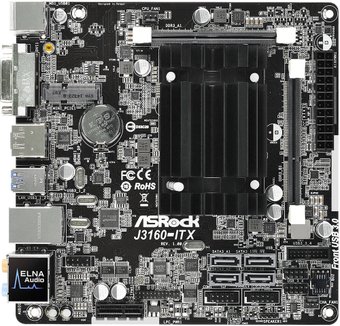 miniITX, c процессором Intel Celeron J3160, память 2xDDR3 SO-DIMM до 1600 МГц, слоты:, 1xPCIe x1