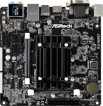 miniITX, c процессором Intel Celeron J3455, память 2xDDR3 SO-DIMM до 1866 МГц, слоты:, 1xPCIe x1, 1xM.2