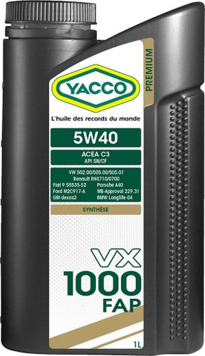 | Спецификации и допуски | VX 1000 FAP 5W-40 официально одобрено: - API SN - BMW Longlife-04 - MB-Approval 229.31 - MB-Approval 226.5 - Porsche A40 - VW 502.00/505.00/505.01 - Renault RN0710 RN0700 VX 1000 FAP 5W-40 соответствует требованиям спецификаций: - ACEA C3-10 - API CF - Fiat 9/55535-S2 - Ford WSS-M2C917-A - GM dexos2 |
