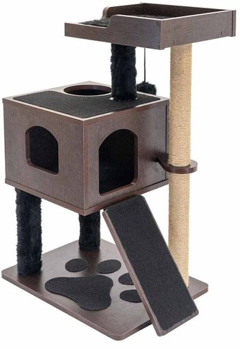 Описание ✅ Комплекс-когтеточка из ЛДСП с джутовыми когтеточками, двумя местами для отдыха, помпоном и ковролиновой ступенькой–когтеточкой. | |