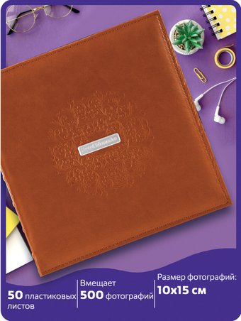 универсальный, 500 фотографий, 10x15 см, материал обложки искусственная кожа, твердый переплет, с кармашками, рисунок/коричневый