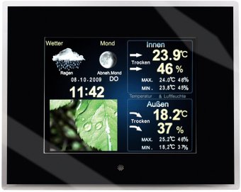 Описание Digital Photo Frame 8" (00090923) – это цифровая фоторамка с погодной станцией. Устройство оснащено датчиками, считывающими температуру/влажность внутри и снаружи помещения. | |