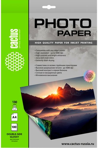 глянцевая фотобумага, плотность 130 г/кв.м, A4, двухсторонняя, струйная печать, 100 листов