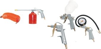 | Комплектация | краскораспылитель с верхним бачком объемом 0,6 л пневмопистолет для вязких жидкостей с бачком 0,85 л пневмопистолет для продувки пневмопистолет для накачки шин с манометорм спиральный шланг 5м |