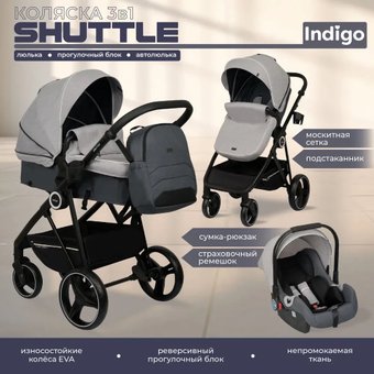 Описание Практичная и многофункциональная всесезонная коляска-трансформер Indigo SHUTTLE предназначена для детей с рождения до 3-х лет. | |