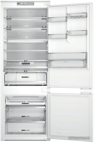 встраиваемый, скользящие направляющие, полный No Frost, электронное управление, полезный объём: 394 л (295 + 99 л), инверторный компрессор, зона свежести, перенавешиваемые двери, складная полка, подставка-лоток для бутылок, лоток для яиц, 69x55.1x193.5 см, белый