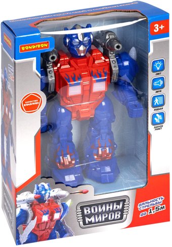 | Комплектация | Робот ВОИНЫ МИРОВ, BONDIBOT Bondibon , свет, звук, движение, стрельба ,ВOX 23×9×28см, арт. M0752-2. |