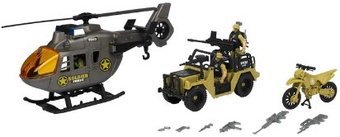 | Комплектация | вертолёт, военная машина, мотоцикл, оружие, 3 солдатика и прочий инвентарь для осуществления миссии |