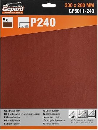 металл/дерево/ДСП/МДФ/пластик/гипсокартон/штукатурка, зернистость 240, 5 в наборе, сухая шлифовка, длина 280 мм, ширина/диаметр 230 мм