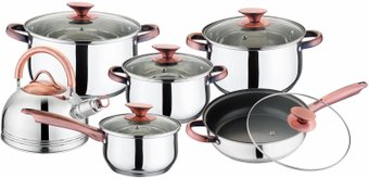 | Состав набора | ковш - 1.9 л; сковорода - 1 шт; кастрюля - 5.8 л, 3.4 л, 2.5 л; чайник - 2.5 л; крышка - 6 шт |