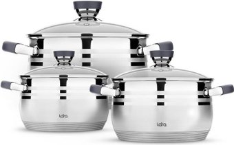 | Состав набора | Кастрюли: LR02-470 2.9л, LR02-472 3.9л, LR02-474 6.5л |