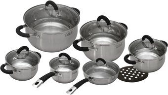 Состав набора сковорода (1 шт.), кастрюля (4 шт.), ковш (1 шт.), подставка под горячее (1 шт.), крышка (6 шт.), нож (3 шт.)